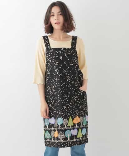 ホコモモラらしいポップなフォレストプリントが目を惹くエプロン。後ろでボタンを留めるタイプで、サイドには丸く、タックの入ったポケットがついた可愛らしいデザイン。お台所の作業も楽しくなるようなカラーリングで、プレゼントにも喜ばれるアイテムです。コットン素材で汚れても手軽にお洗濯して頂けます。model:H160 B81 W58 H81 着用サイズ:M