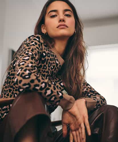 しっかりとした目付に柔らかな質感が特徴の、レーヨンミックスの編み地で仕立てたニットプルオーバー。幅広いスタイリングに合わせやすいクルーネックに、ジャカードで表現したレオパード柄が存在感抜群の一着です。リブは編み地のピッチに変化を付けてアクセントにしました。 model:H170 B81 W59 H88 着用サイズ:M
