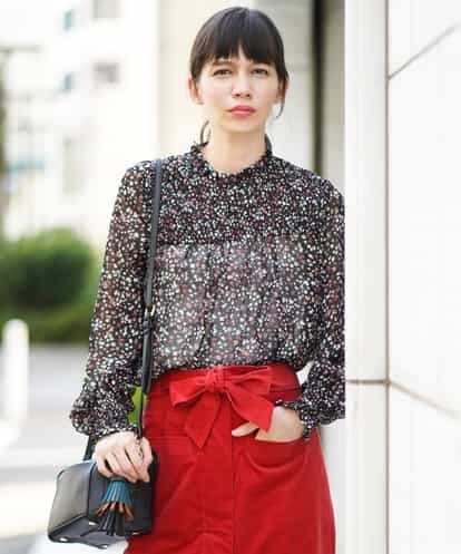 透け感のあるエレガントなテキスタイルに、華やかなフラワーモチーフ柄が映えるプルオーバーブラウスです。鮮やかな小花柄に、袖口や身頃に部分的に施したシャーリングがさらにフェミニンな表情をプラスした一着です。フリルカラーにバックにあしらったアンティーク調のデザインボタンもさりげないポイントになっています。model:H167 B80 W58 H87 着用サイズ:M
