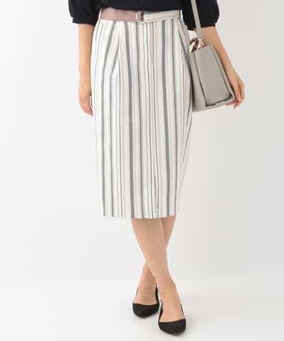 細身のペンシルシルエットとフロントスリットが落ち着きのある雰囲気に仕上げるスカートです。2本のタックがヒップ周りにゆとりをもたせ、ウエスト後ろのみゴムを入れているので、はき心地もリラクシーに。ランダムに入ったストライプ柄がIラインを強調し、スタイリッシュなスタイリングにまとめます。共布のベルトでメリハリのあるシルエットにも。※裏地付き、フロントファスナー。model:H167 B80 W59 H84 着用サイズ:M
