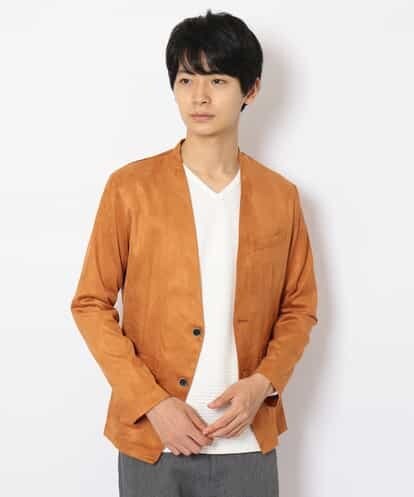 高級感のあるフェイクスエードで仕立てたジャケットです。すっきりとしたノーカラーに、裾にかけて開いたラフなカッティングがポイントになった一着です。スタイリングをランクアップさせてくれるテキスタイルの風合いに、カジュアルダウンして楽しめるデザインが魅力のジャケットです。model:H185 C86 W71 H91 着用サイズ:L