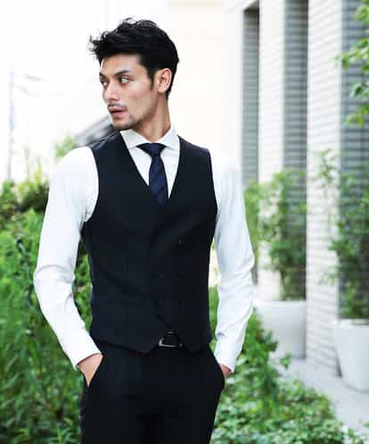 セットアップスーツ(MNNJD91690)と組み合わせでお楽しみいただけるジレです。 2/80×2/80の細番手を使用した綾組織素材はオールシーズン活躍できます。 組成(毛50%ポリエステル50%)がもたらす、防シワ性、程よいストレッチ性でストレスフリーな着装感をお楽しみいただけます。 写真からもご覧いただける様に、微光沢フィニッシュによる高級感を纏っております。 〇今年のトレンドのダブルブレストデザインのベストは、同素材のパンツの脇線と、べストの脇線が一直線に合い、美しいいで立ちを見せるシルエットです。 〇後身頃と裏地には、体の動きに追従する、ストレッチ裏地を使用しています。 ※本商品(MNVJD91250 )は単品でもお使いいただけるジレです。 スーツ(MNNJD91690)は別売りとなっております。 進化したミッシェルクランオムのモードをぜひ体感してみて下さい